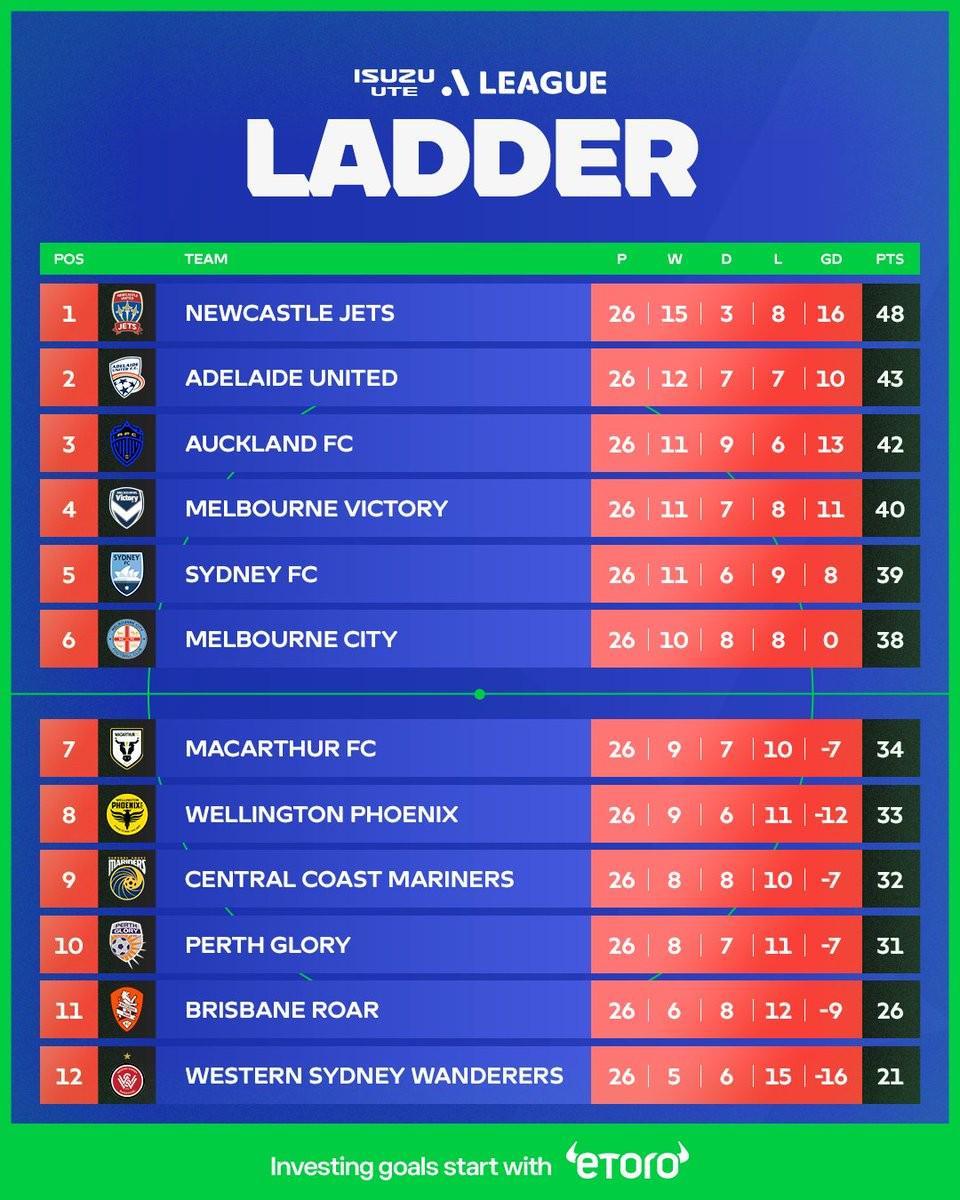 墨尔本胜利、悉尼分列四、五位,墨尔本城以38分锁定第六名,拿到最后一张季后赛门票。麦克阿瑟FC、惠灵顿凤凰等球队遗憾止步常规赛,无缘季后赛舞台。西悉尼流浪者仅积21分位列垫底。